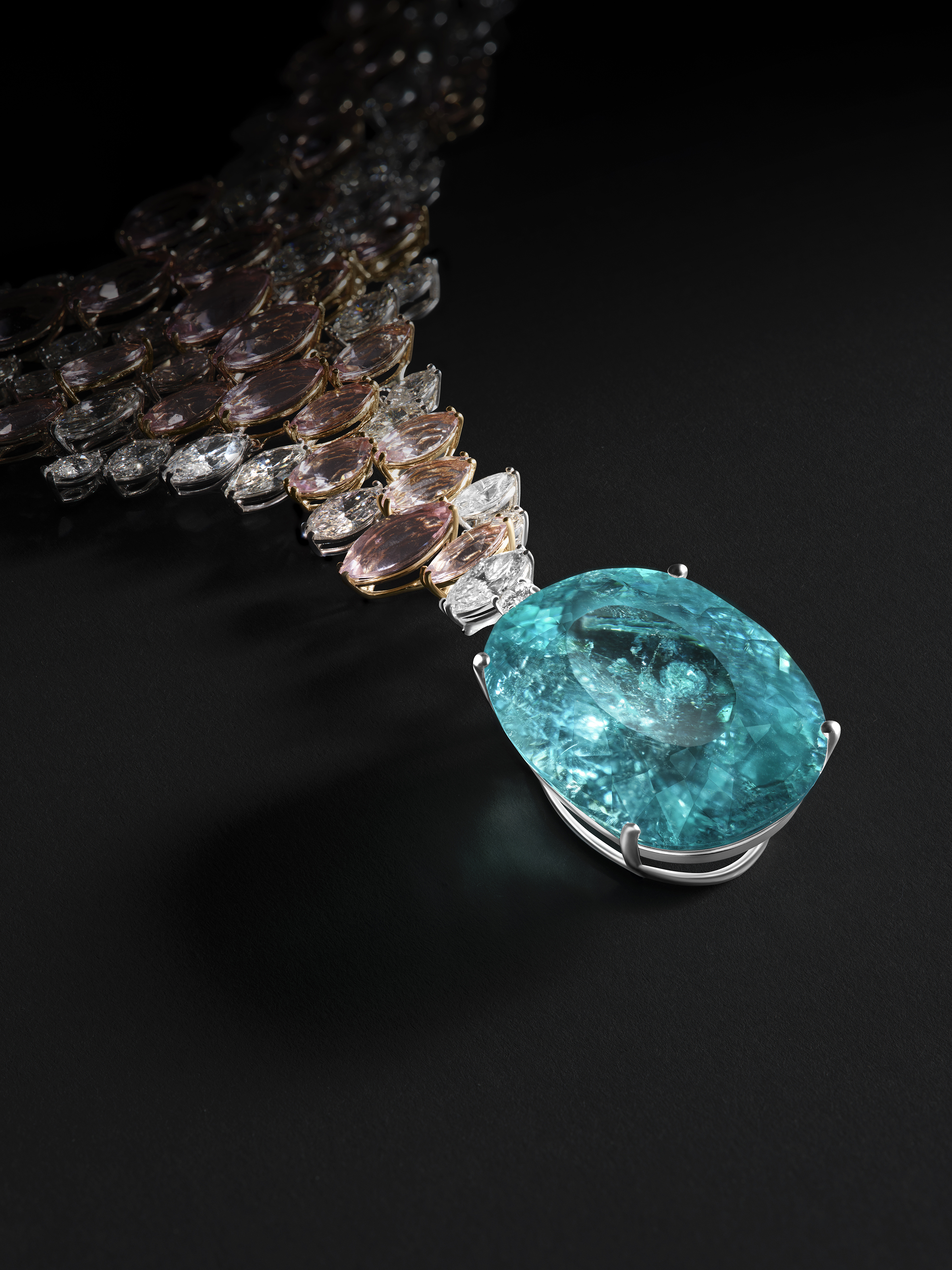 For example, Paraiba tourmalines in various carats defined the “Lights of the Sea” line dedicated to the Italian coast and its most famed destinations. Cue the stunning Marea Rosa, or Pink Tide, necklace evoking the colors of Sardinia and the glare of the sun on the sea with its array of marquise-cut pink morganites and diamonds, culminating in the central oval-cut Paraiba tourmaline pendant.