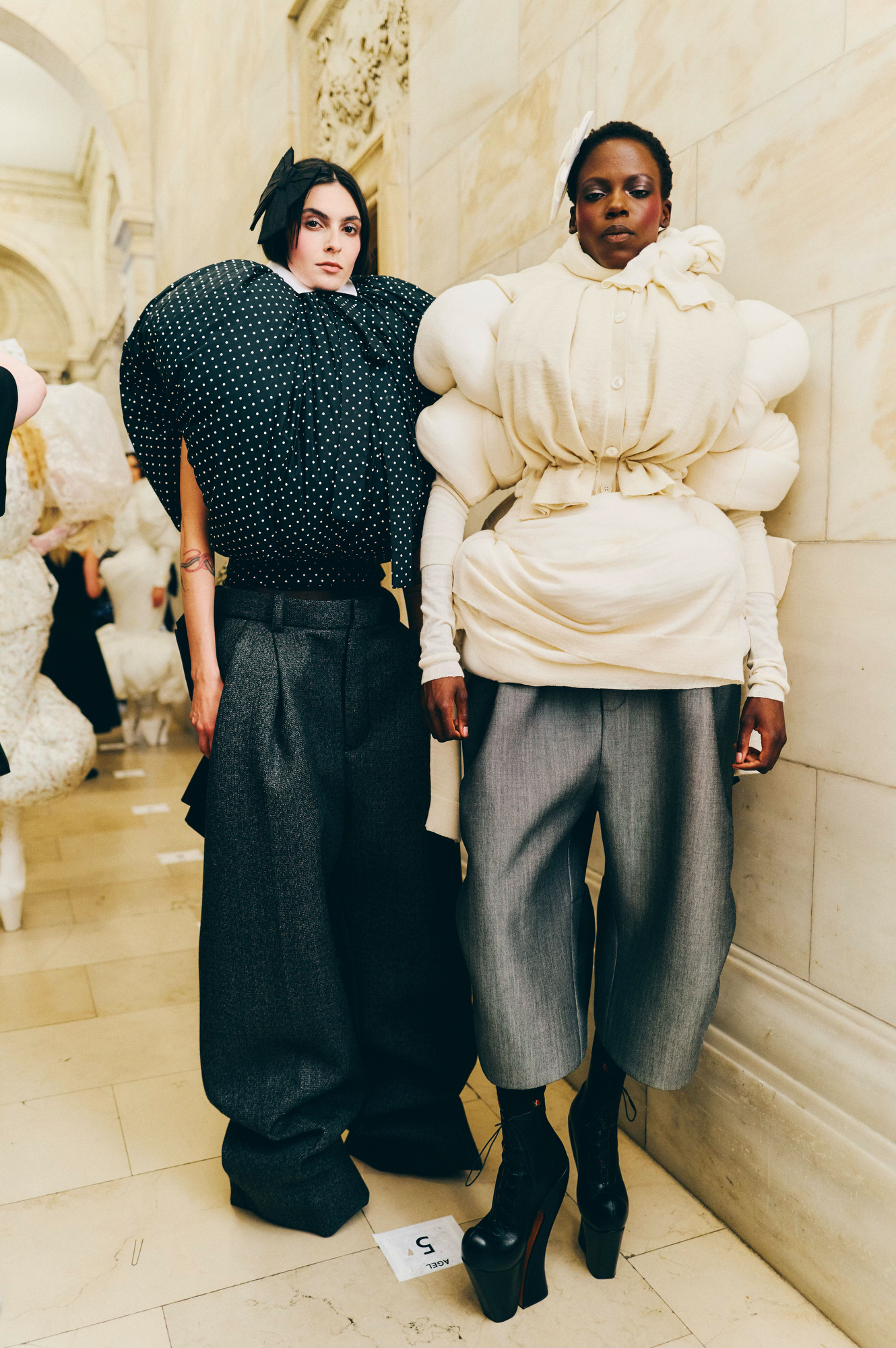 His words came to mind on Monday night, seen through through the fall collection, a fabulous continuation of the larger than life, twisted, doll-like takes on the familiar – the vocabulary he’s been developing strongly over the last few years. Jacobs leaned into Victorian shapes mixed with a bit of grunge, as seen through look one model’s giant lilac lace blouse, grounded with extra large and baggy cargo pants featuring a big bow on its rear. There were bows galore, also seen on the backs of almost every look, including gorgeous sculptural lace gowns (in pretty pastels or darker, vampy hues) and cinched up or pin-tucked big pants; in the models’ hair, or twisted into a bulbous, pale pink layered lingerie dress that fell off the body just-so.