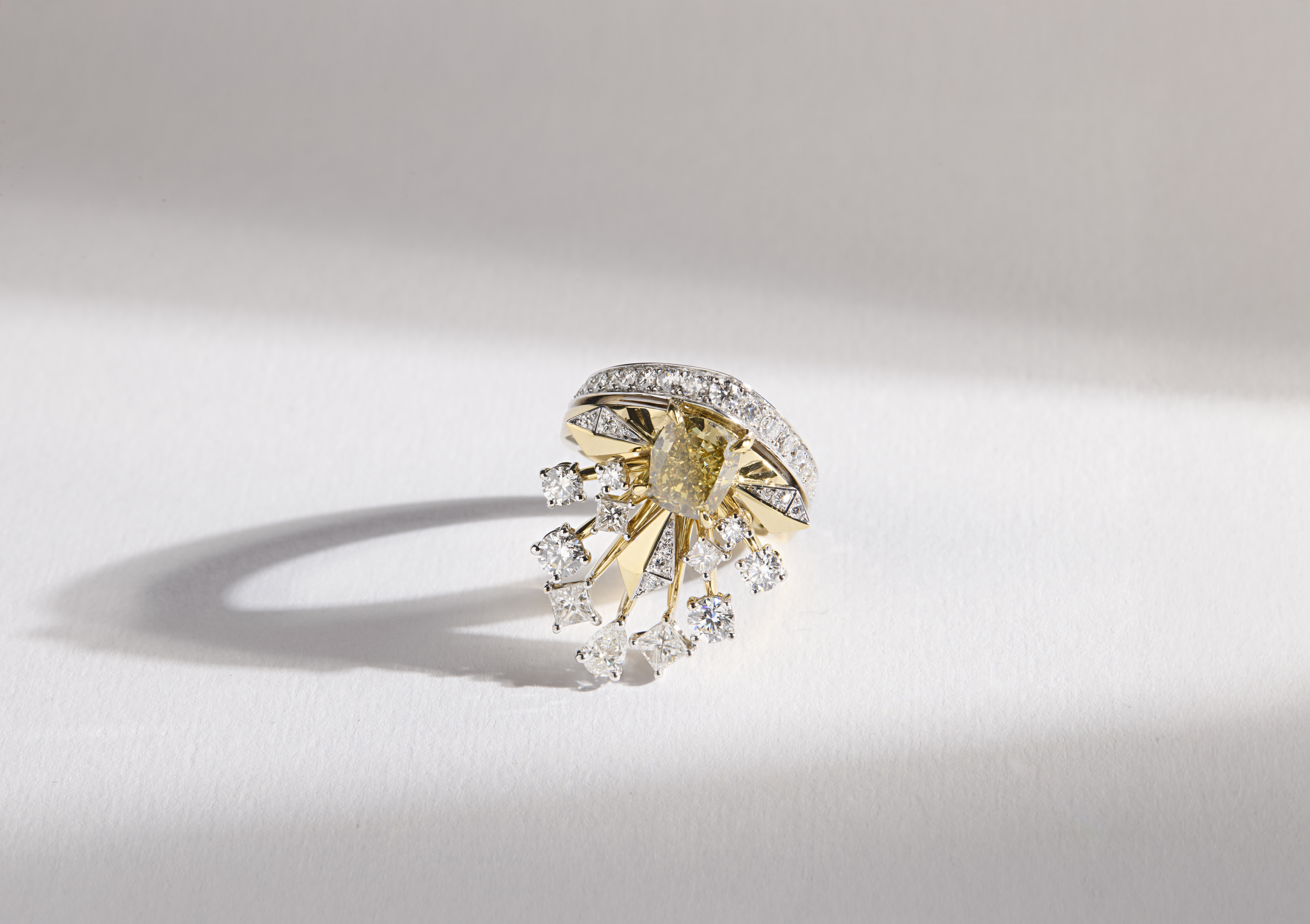 The Lunar Eclipse necklace captures the mystery of the lunar cycle and its focal point is a 15.59-carat fancy yellow diamond, surrounded by 1,100 stones set in 250 grams of gold. This complex piece was initially created in a single gold hue, then it was carefully disassembled and reassembled by hand in a second tone, resulting in a duality that mirrors the interplay between the sun and the moon.