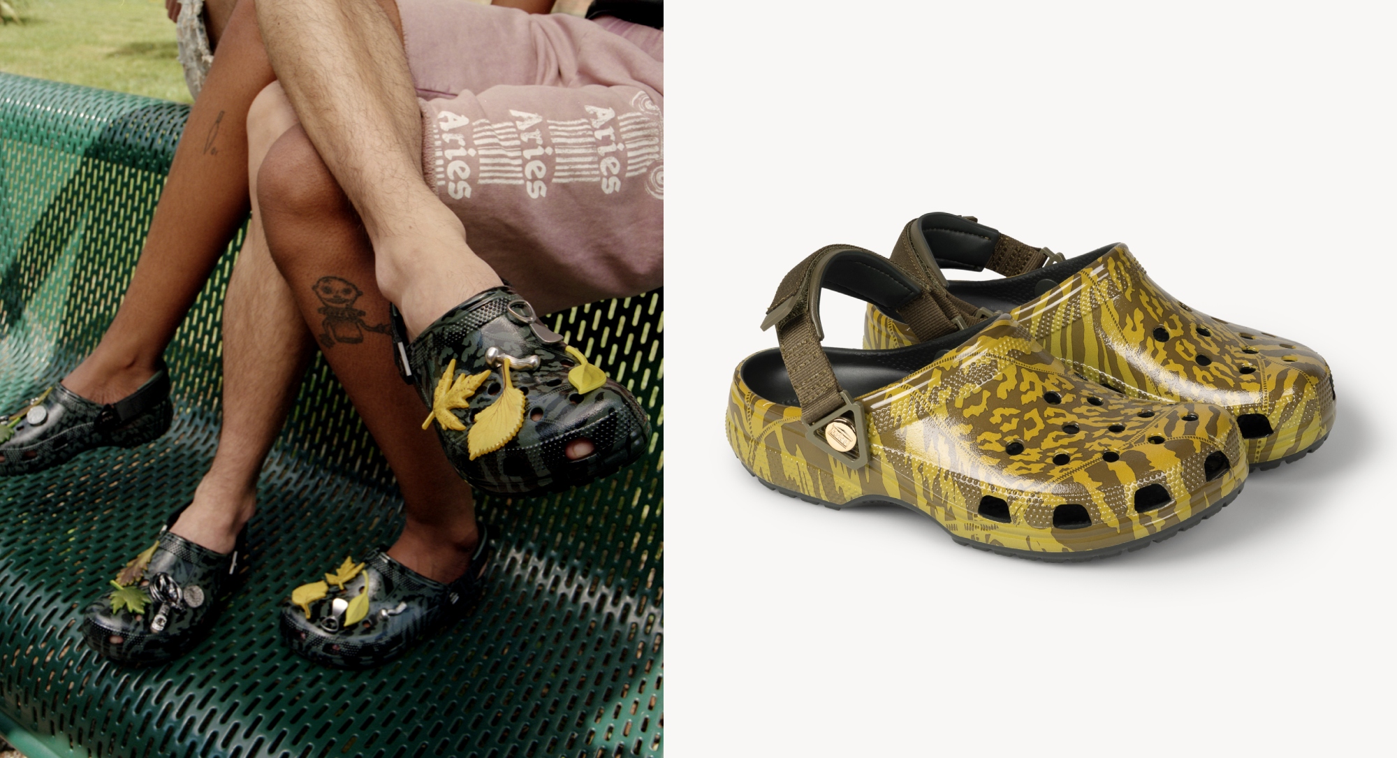 The latest drop offers two exclusive colorways of the Crocs Classic Clog, with the recognizable Aries’ flair. The new Aries x Crocs Classic Clogs arrive in camouflage styles, featuring the High Shine Black and Dark Algae Green colorways.