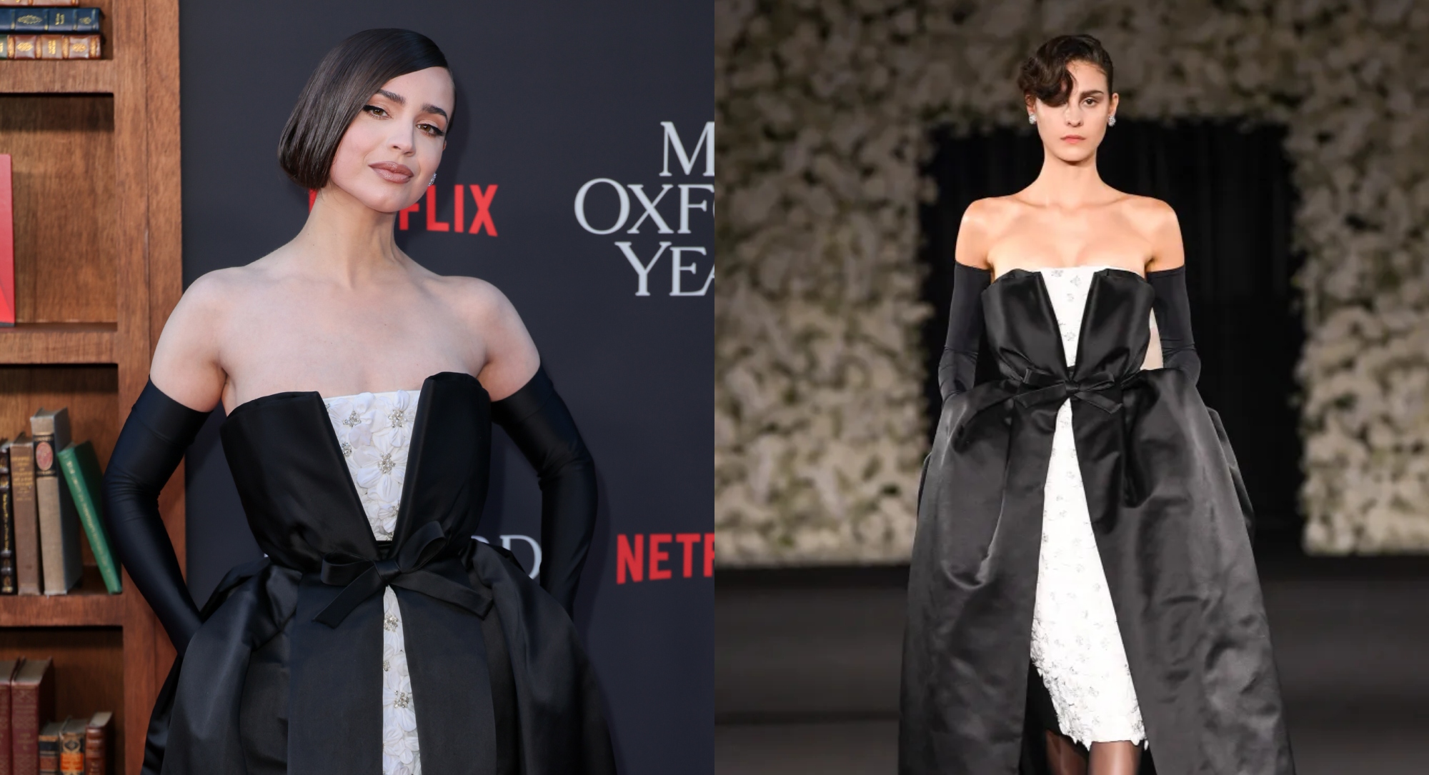 Sofia Carson embraced classic glamour in a Richard Quinn black and white gown for the red carpet premiere of her Netflix film “My Oxford Year” in Los Angeles on Thursday.