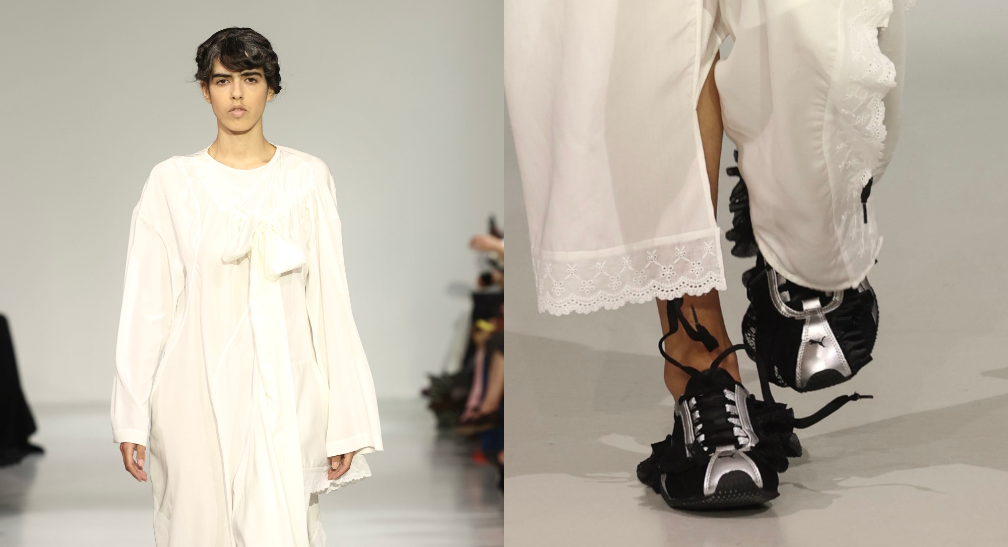 The low-profile Puma H-Street, which is inspired Puma’s running spike Harambee from the ’90s, was reintroduced earlier this year — this week, it hit the Rave Review runway in silver with lacy ruffle detailing, with some models displaying a black version of the adornment and others a white version.