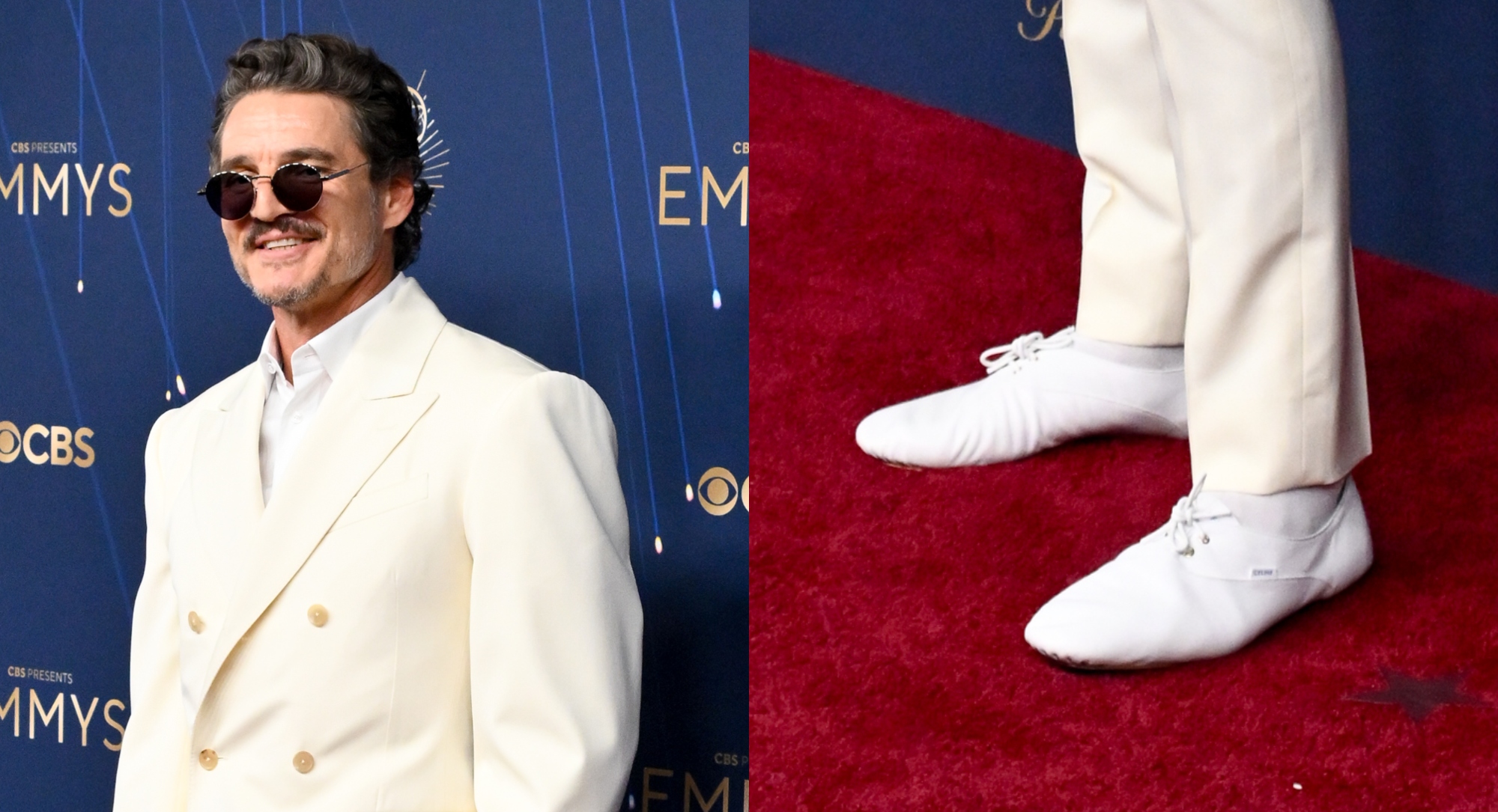 Pedro Pascal fully embraced the slim shoe trend with a pair of white lace-up derby shoes from Celine, showcasing a dancerly quality. He chose the streamlined, low-to-the-ground look to go with an ivory suit featuring a double-breasted blazer.