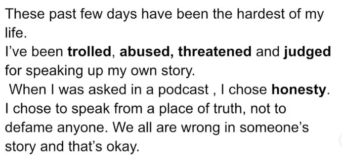 “These past few days have been the hardest of my life. I’ve been trolled, abused, threatened and judged for speaking up my own story. The hate I’ve received has been vicious: abuses, slut-shaming, character assassination, and even death threats for me and my family. When I was asked in a podcast, I chose honesty. I chose to speak from a place of truth, not to defame anyone.”