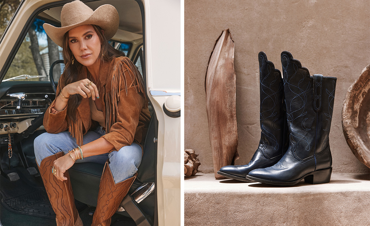 For the women’s styles, the Sarah and Abbie boots take cues from Scott’s jewelry designs on the same time and embrace a distinctly ‘70s-inspired femininity, showcasing rounded toes, cowboy heels, and vintage-inspired details. The Sarah boot features moon phase embroidery and bluebonnet-inspired scalloping, while the Abbie boot stands out with its bold shape and nod to spirited cowgirls.