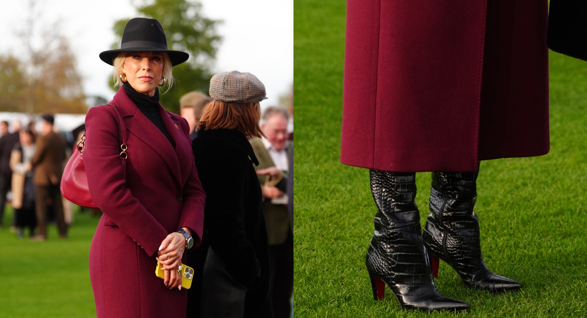 The “Ted Lasso” star went with a matchy-matchy look, toting around a handbag in a similar-looking rich red shade. Elsewhere in her ensemble, Waddingham donned a black turtleneck knit. She rounded out the polished fashion moment with a black fedora, thick gold hoops, an equally chunky ring and a black watch. Waddingham’s blonde tresses peek out from underneath the hat, while her makeup was minimal and soft. During the lively outdoor event, she presented an award to the winner of the Novices Hurdle.