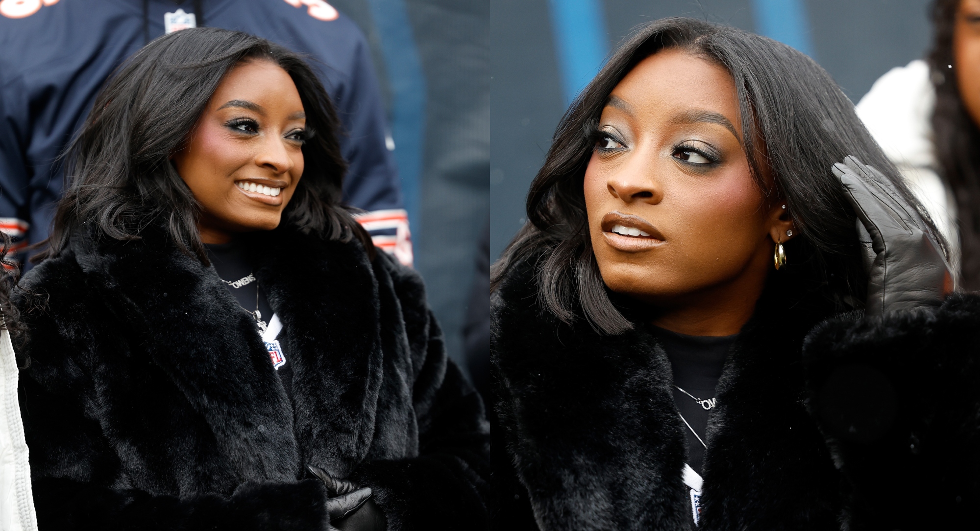Simone Biles welcomed the winter season early in a cozy black coat and coordinated black gloves with a sporty edge in her football jersey for the Chicago Bears and New York Giants game on Sunday in Chicago.