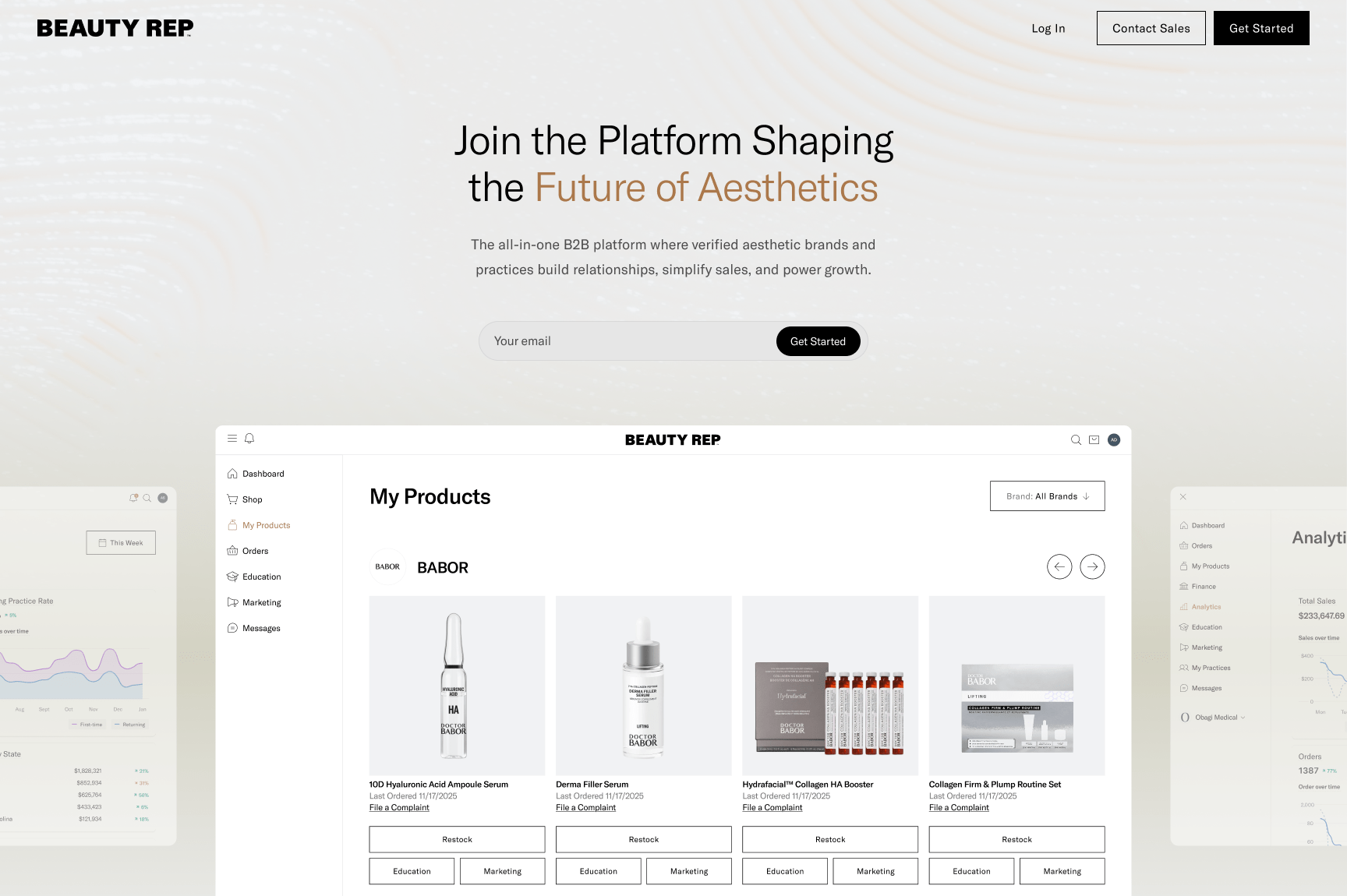 Beauty Rep addresses several of the pain points that medical aesthetics is facing today, chief among them the process of providers purchasing product from brands. Without Beauty Rep, providers deal with individual sales reps and separate processes for each one they work with. With Beauty Rep, brands are discoverable and shoppable on the same platform, and providers can manage the buying process across these brands in one place. Brand partners currently include Babor, Linder Health, AlumierMD, Dermaesthetics Beverly Hills, Avea Life, CielementsMD, Cosmetics27 and Marini Skin Solutions. Beauty Rep will continue to expand its offering to include the typical assortment seen in medical aesthetics offices.
