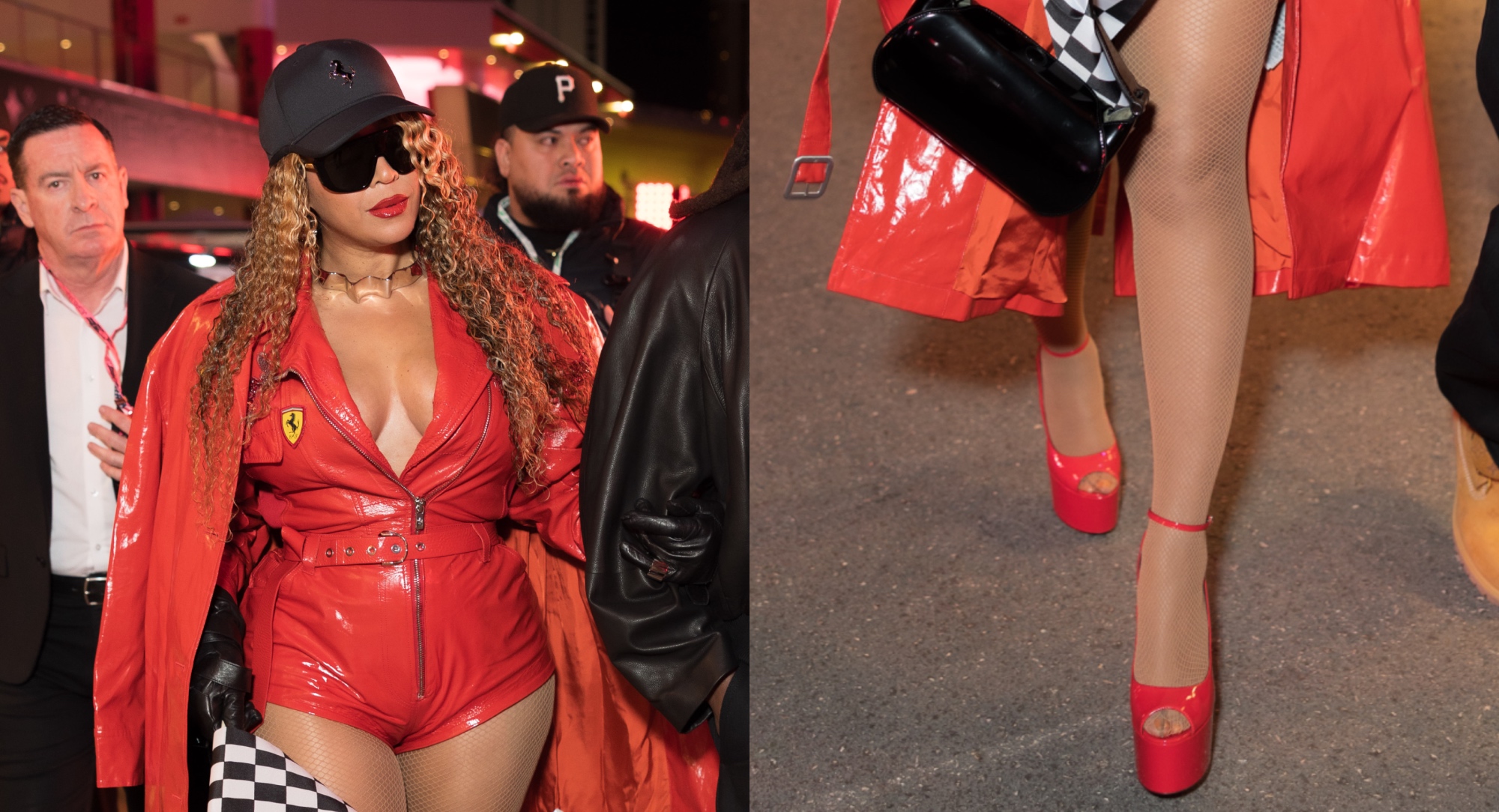 Beyoncé brought the heat to the Formula 1 Grand Prix in Las Vegas on Saturday night, hitting the annual sporting event in a head-to-toe fiery red vinyl look, complete with equally shiny towering heels.