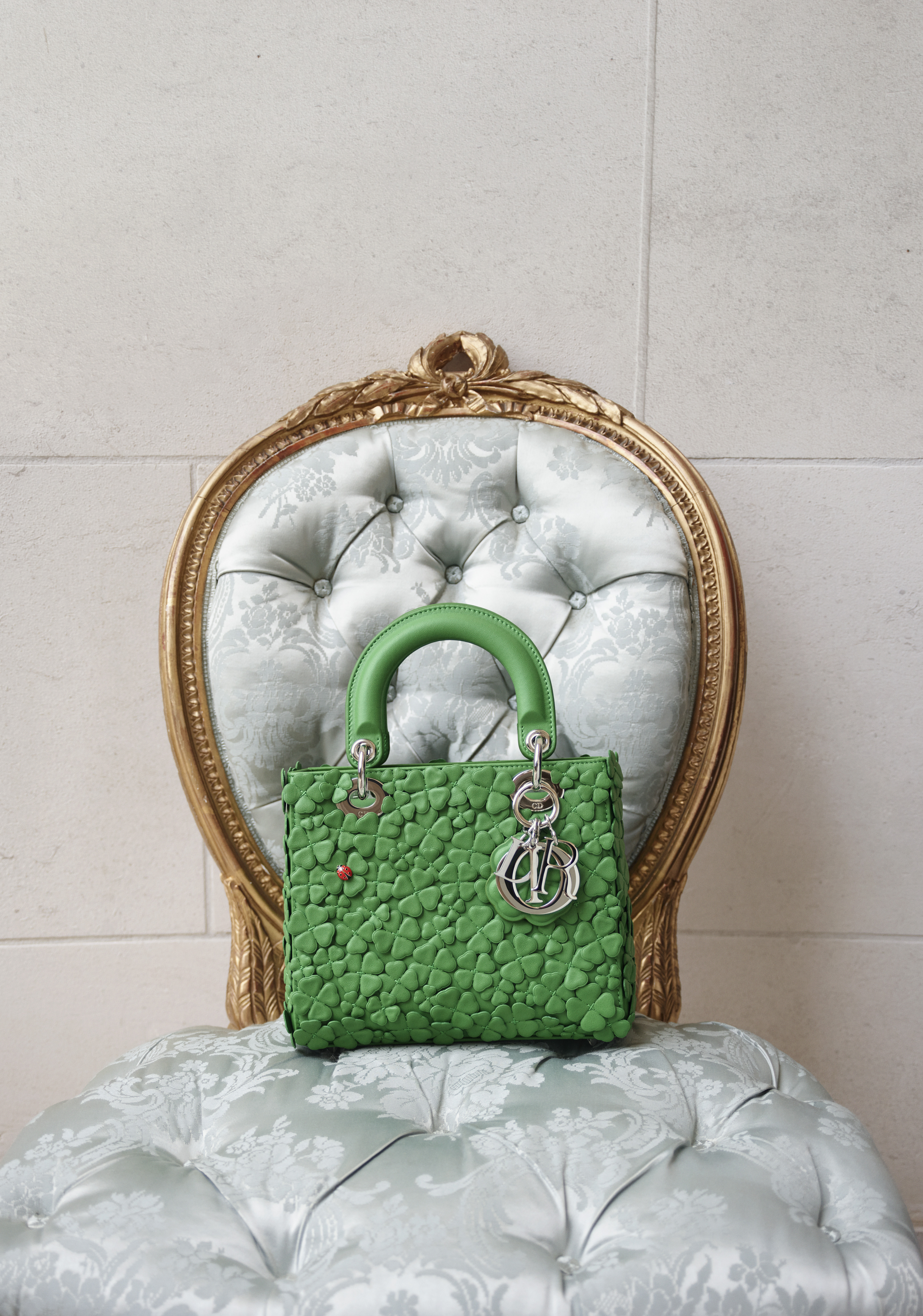 Womenswear features the lucky clover, a longstanding Dior motif, on T-shirts, denim, and a variation of the Lady Dior bag, all from the spring 2026 collection. There is also the Cigale bag, an homage to a signature haute couture dress designed by Christian Dior in 1952, Médaillon belts, Initials pumps, and bag charms.
