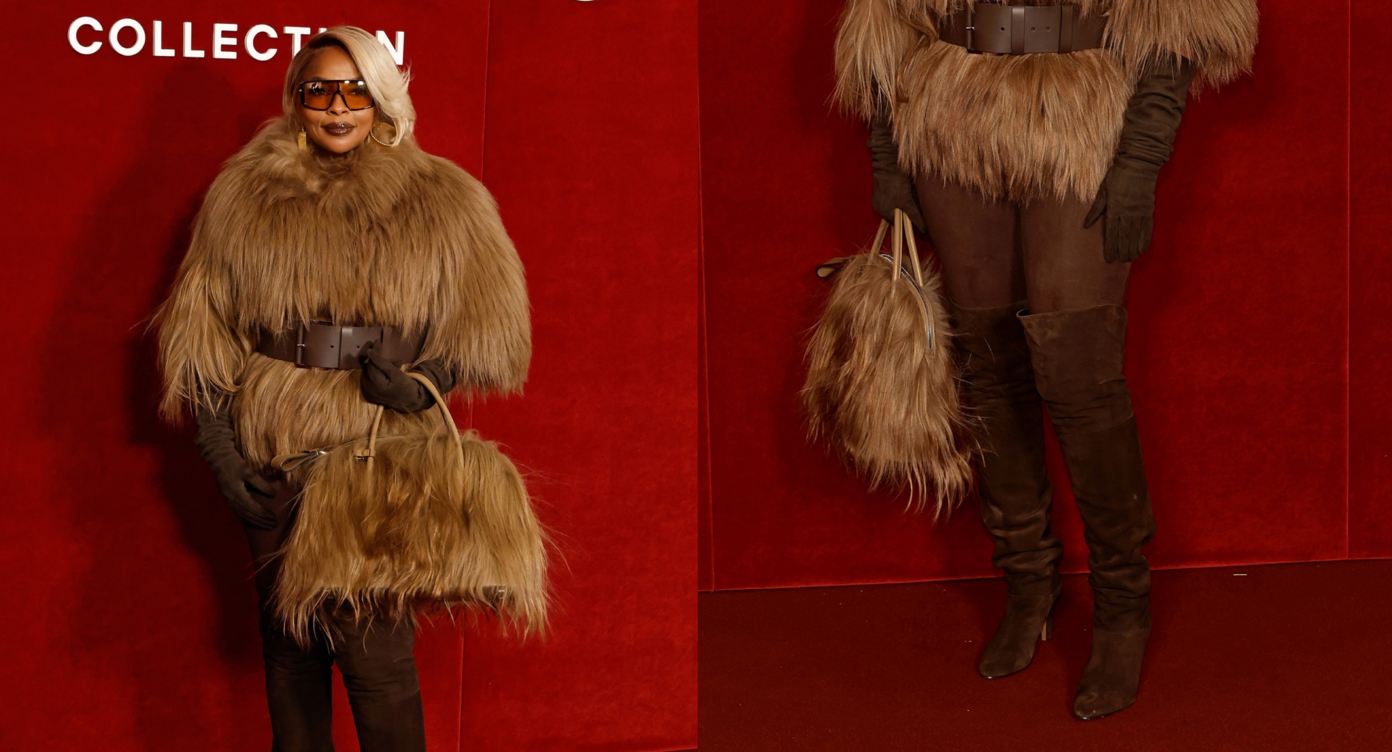 Though the boots certainly made a statement, the true pièce de résistance of Blige’s look was her Michael Kors faux fur jacket. Designed with elbow-grazing sleeves and a structured high neckline, the shaggy outerwear was cinched at the waist with a thick brown leather belt, giving the voluminous silhouette a defined shape.