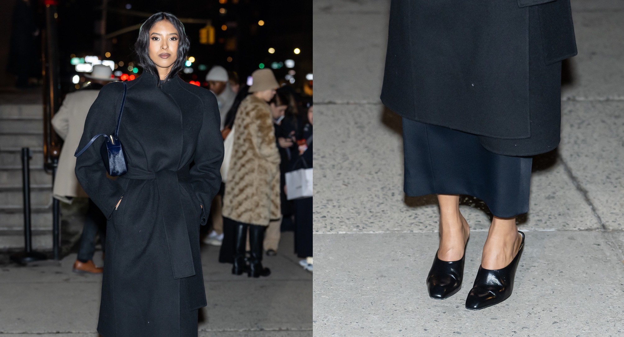 The USC graduate teamed the shoes with a long black wool coat, presumably from Khaite. The outerwear featured a subtle funnel neck, with Bryant’s dark brunette hair tucked inside—a styling trick made famous by the Olsen twins in the early aughts and recently coined the “Olsen tuck” by TikTok users.