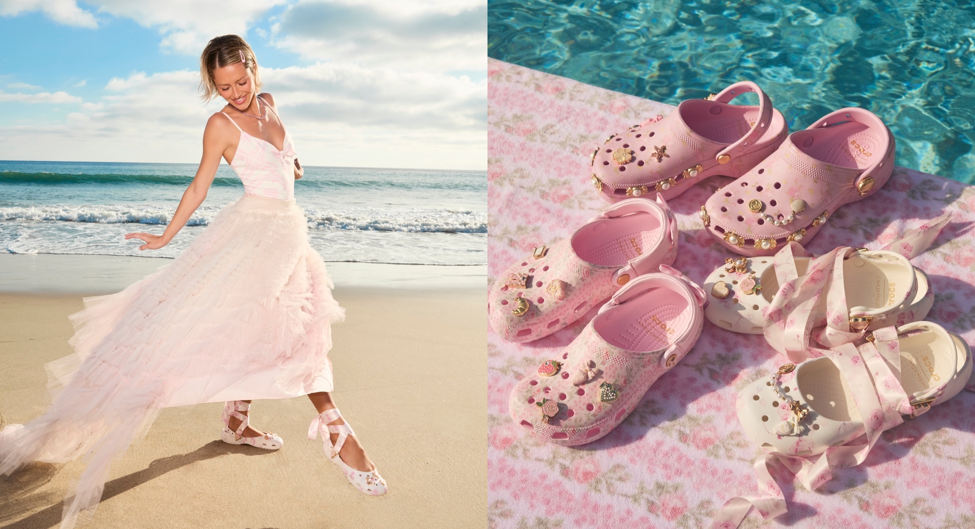 Crocs and LoveShackFancy have teamed up for the first time to infuse clogs with whimsy and feminine flair, presenting a suite of romantically reimagined silhouettes launching March 5.